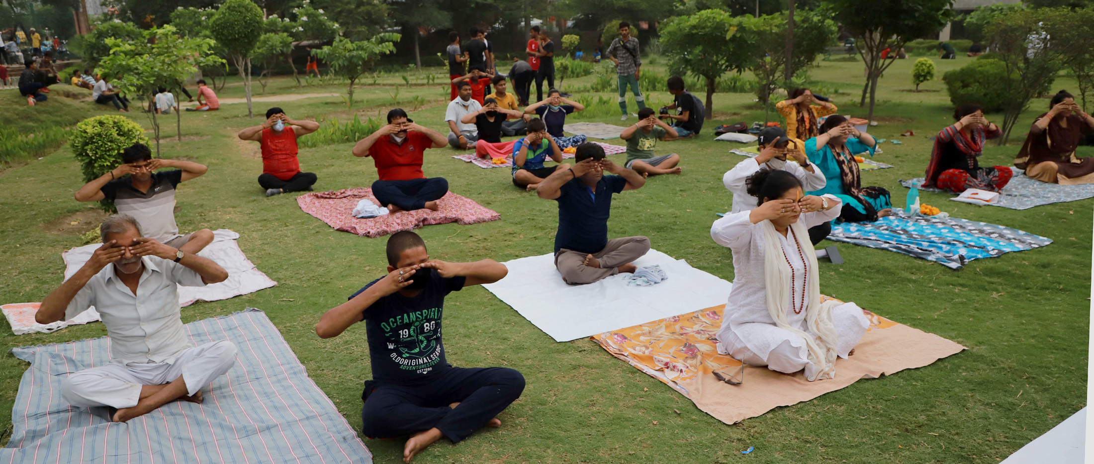 People’ perform Yoga, on the occasion of the 6th International Day of Yoga 2020, at Pratap Vihar park, in Delhi NCR on June 21, 2020.
