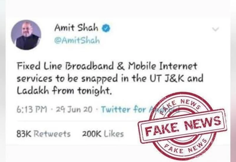 A fake tweet was doing the rounds on social media in the name of Shah that read, "Fixed Line Broadband and Mobile Internet services to be snapped in the UT J&K and Ladakh from tonight."