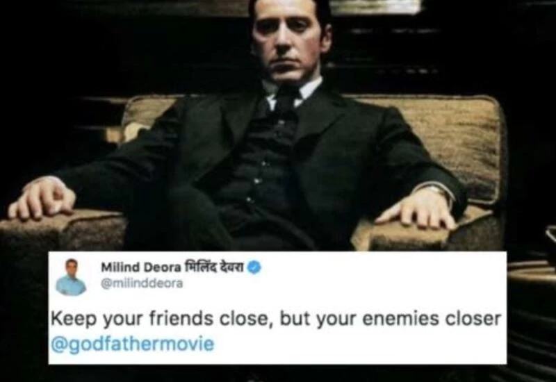 "Keep your friends close, but your enemies closer," tweeted Congress leader Milind Deora, quoting the line from the classic, "The Godfather".