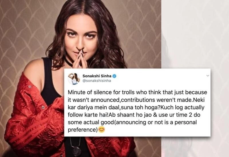 Sonakshi tweeted late Tuesday, “Minute of silence for trolls who think that just because it wasn’t announced,contributions weren’t made.Neki kar dariya mein daal,suna toh hoga? Kuch log actually follow karte hai! Ab shaant ho jao & use ur time 2 do some actual good (announcing or not is a personal preference)Smiling face with smiling eyes.”
