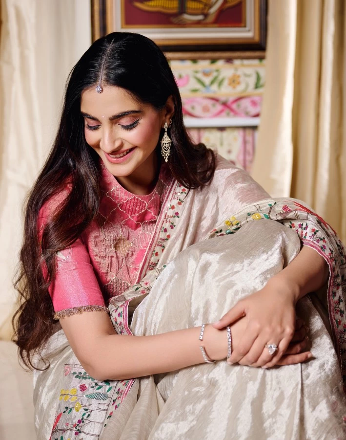 Sonam Kapoor Ahuja sparkles in Zoya’s beautiful jewellery from luxury atelier Zoya paired with a couture saree on the occasion of Karvachauth. In her Instagram post, the style icon is seen comfortably seated on the floor wearing a beige, embroidered saree with a pink blouse. “I’ll take any chance to celebrate love, faith, and togetherness and dress up,” says Sonam in her post. What catches our eye are the splendid diamonds she’s used to accessorize her look. “Thank you for insane diamonds @zoyajewels,” she concludes.