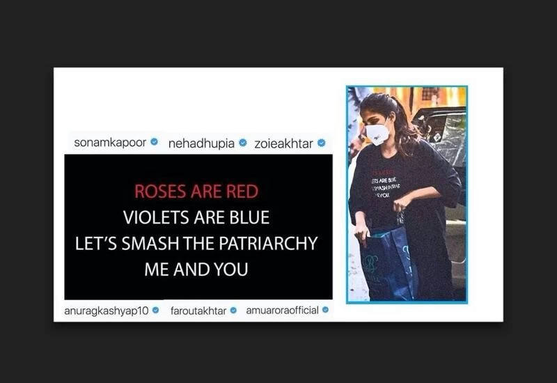 "Roses are red, violets are blue, let's smash patriarchy, me and you," was the message written on Rhea's t-shirt. It found echo in Bollywood with the celebs sharing the quote on their respective Instagram handles and some also sought justice for her.