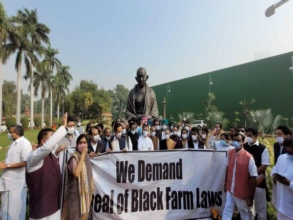 New Delhi: Congress MPs including party interim president Sonia Gandhi and Rahul Gandhi staged a protest in front of Mahatma Gandhi's statue inside the Parliament premises on Monday demanding repeal of three farm laws.