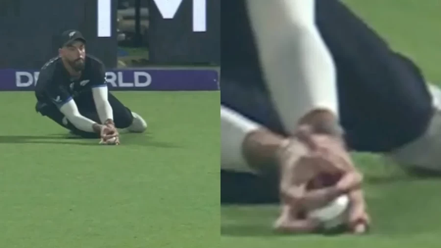 In the 8th over, bowled by Rachin Ravindra, Aiden Markram attempted a lofted shot towards the long-on boundary. The ball took the inner half of the bat and flew low towards Daryl Mitchell, who was stationed in the deep. Mitchell made a forward-diving effort to claim the catch. Immediately after the catch, Mitchell signaled that he was unsure if the ball had carried cleanly, prompting the on-field umpire Alex Wharf to refer the decision to the third umpire without a soft signal. The visual evidence initially appeared inconclusive, as the ball seemed extremely close to the turf at the point of contact.