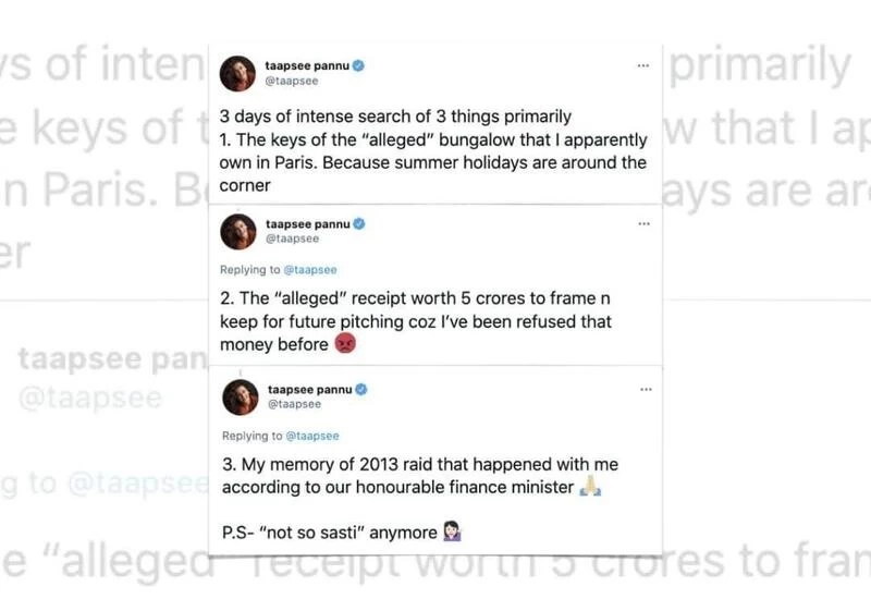 Her posts came three days after Wednesday's raids over alleged tax evasion. Filmmaker Anurag Kashyap, too, was raided by the I-T department. Both were reportedly questioned by officials in Pune. Searches took place at 30 locations in Mumbai and Pune.