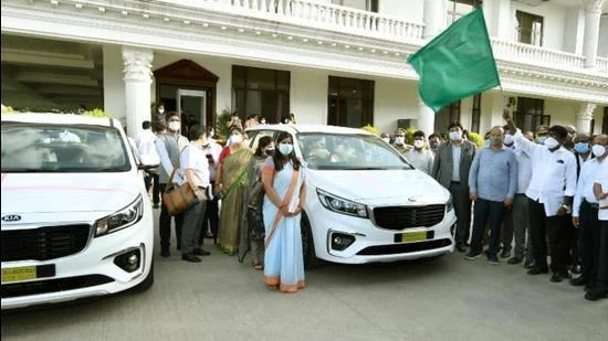 All the KIA vehicles of Carnival model were lined up at Pragati Bhavan before being flagged off by transport minister Puvvada Ajay Kumar in the presence of chief secretary Somesh Kumar and deputy transport commissioner Papa Rao.