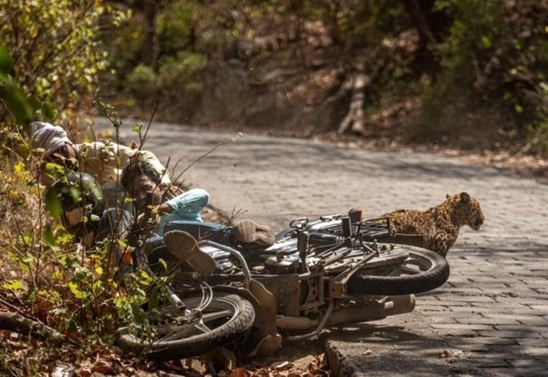 Three people were sitting on the bike, their balance was stabbed when the leopard came in the way and at the same time the leopard fell. However, during this time three people came to minor injuries, leopard immediately escaped from there.