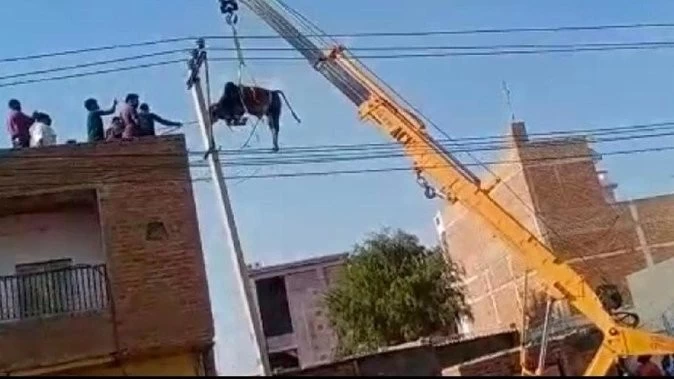 The bull that reached the roof started seeing the people and creating the product. After a lot of efforts, people could not get the bull down from the roof. After this a crane was called to unload the bull. Some people caught the bull and blindfolded it and then tied it in a crane and brought it down. During this, a huge crowd of people had gathered around the spot.