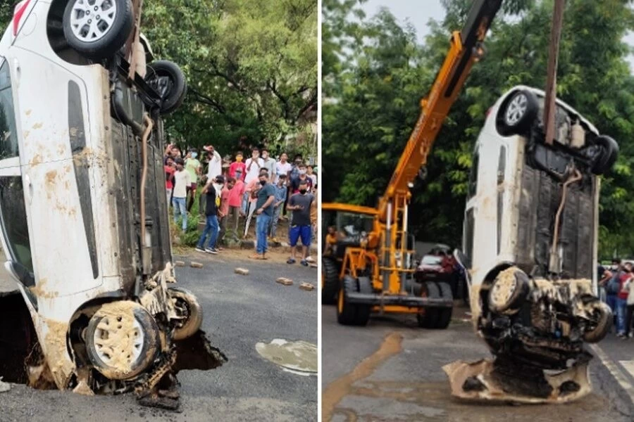 The rain has given some relief from the heat to the Delhi, but the rain side effects have also started coming. A car moving on the main road in Dwarka area of Delhi went to the ground. The car rider in this accident saved his life very difficult. It is being told that this i-10 car is a young man of Delhi. Together with a friend, Dwarka was passing through the Incredible Chowk of Sector 18. At the same time, the road of Main Road went to the road and the moving car went inside the ground. This jawan of Delhi Police is deployed in traffic in Ashwani Patel Nagar Circle.