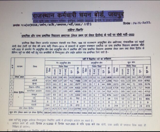 Rajasthan 3rd Grade Teacher Recruitment 2022 : Rajasthan Staff Selection Board has issued a notification for the recruitment of 48 thousand posts of Primary and Upper Primary School Teacher (Level I and II). Applications have been invited for the recruitment from December 21 to January 19. The board has also fixed the exam date. The recruitment exam will be conducted from 25 to 28 February.