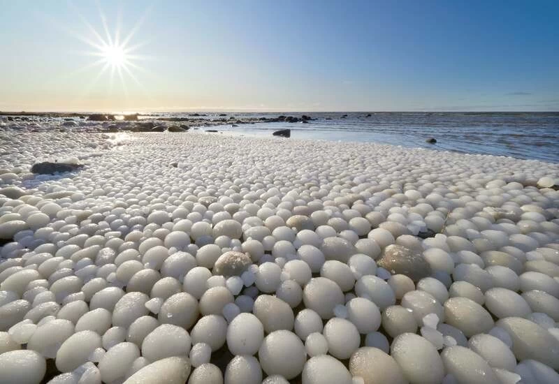 Risto Mattila, who photographed the eggs, said he and his wife were walking along Marjaniemi beach on Hailuoto island on Sunday when they came across the icy balls covering a 30-metre (98ft) expanse of shoreline.
