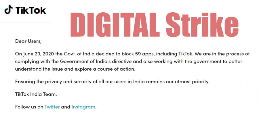 On June 29, 2020 the Govt. of India decided to block 59 apps, including TikTok. We are in the process of complying with the Government of India's directive and also working with the government to better understand the issue and explore a course of action.
