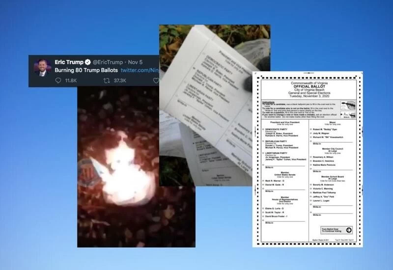 The footage shows a man pouring a flammable liquid into a bag of what he claims are 80 paper ballots "all for President Trump" and setting them on fire. The pieces of paper show races in Virginia Beach, Virginia, but are clearly sample ballots and not real votes, city officials told news outlets on Tuesday.