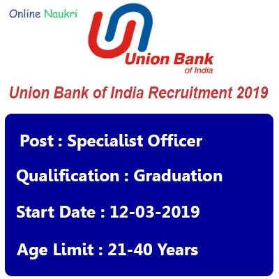 Information: Union Bank of India has declared the notification for the recruitment Specialist Officer (Fire Officer, Economist, Security Officer, Integrated Treasury Officer, Credit Officer & Forex Officer) vacancies. Qualification required is Graduation with Relevant Experience, MBA / PGDBA / PGDBM, PG. The interested candidates can apply online from 12-03-2019.