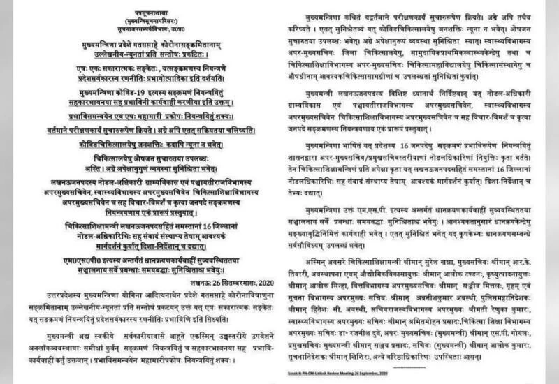 An official press note regarding the Covid-19 review meeting held here on Saturday was issued in the Sanskrit language. The meeting was presided over by Chief Minister Yogi Adityanath.