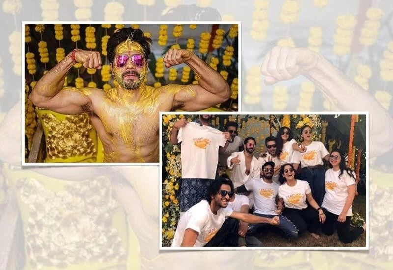 Flaunting his biceps in the picture, Varun Dhawan was covered in Haldi as he posed for the pictures. He was surrounded by 'Team Ladkewale' including family members and close friends. "HALDI done right," he captioned the pictures.