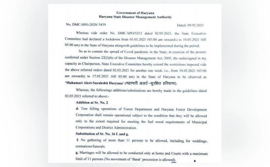 Only 11 people will be able to attend the wedding ceremony and funeral. The wedding procession will not go, but the marriage program will have to be done in the house or court itself. Chief Secretary Vijayavardhan has issued written orders of epidemic alert-safe Haryana, which will be in force from Monday to May 17. In the first marriage ceremony, a maximum of 30 people were allowed to gather in indoor venues and a maximum of 50 people in open spaces.