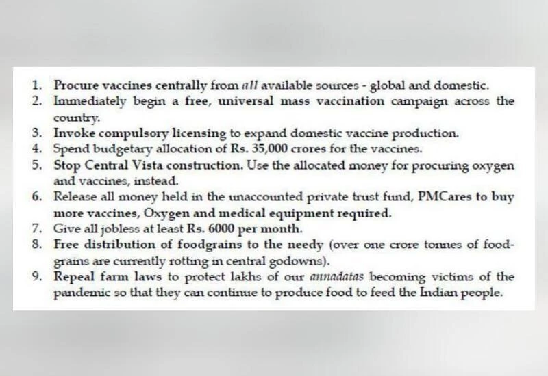 "Procure vaccines centrally from all available sources - global and domestic. Immediately begin a free, universal mass vaccination campaign across the country. Invoke compulsory licensing to expand domestic vaccine production. Spend budgetary allocation of Rs 35,000 crores for the vaccines," the leaders said in their letter. "Stop Central Vista construction. Use the allocated money for procuring oxygen and vaccines, instead. Release all money held in the unaccounted private trust fund, PM Cares to buy more vaccines, Oxygen and medical equipment required," they also told the prime minister.