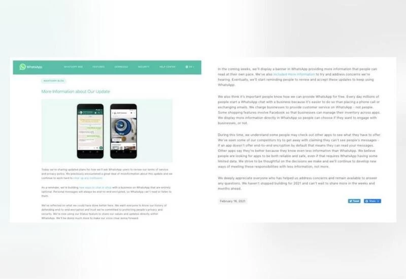 "...but the Terms of Service and Privacy Policy remain the same. As a reminder, this update does not change the privacy of people's personal conversations and does not expand our ability to share data with Facebook," WhatsApp said.