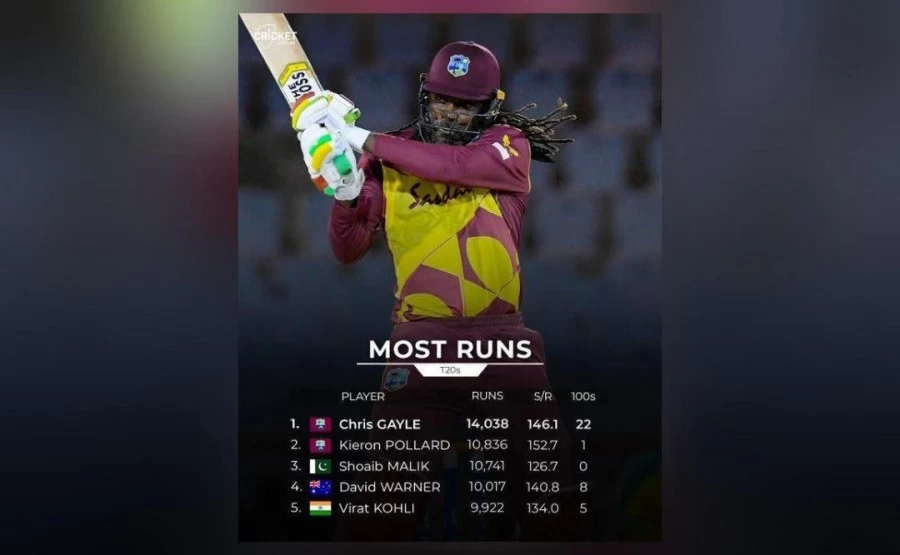 West Indies batsman Chris Gayle is in numero uno position, becoming the first batsman in history to score over 14,000 runs in T20 games. Gayle now has 14,038 runs at a strike-rate of 146.1 with 22 hundreds in T20 cricket.