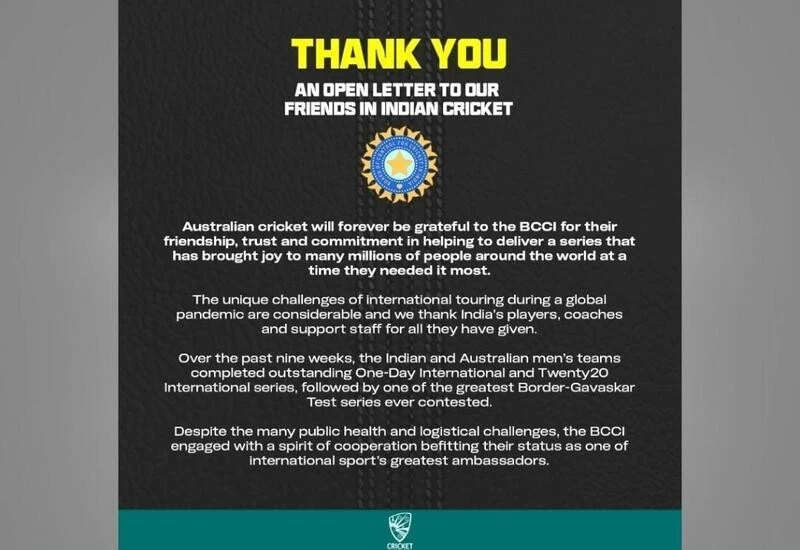 "Australian cricket will forever be grateful to the BCCI for their friendship, trust and commitment in helping to deliver a series that has brought joy to many millions of people around the world at a time they needed it most," CA said in the letter.