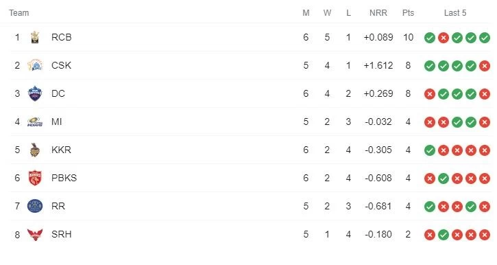 IPL Points Table | On Tuesday (April 27) in the Indian Premier League (IPL) 2021, the match was played between Royal Challengers Bangalore (RCB) and Delhi Capitals, which was drawn to the last ball and finally RCB won by one run. The match was played at the Narendra Modi Cricket Stadium in Ahmedabad. RCB reached the top of the point table with this win. This was RCB's fifth win in six matches. RCB bounced back and beat Delhi Capitals in a thrilling contest after a 69-run defeat against Chennai Super Kings (CSK) in the previous match.