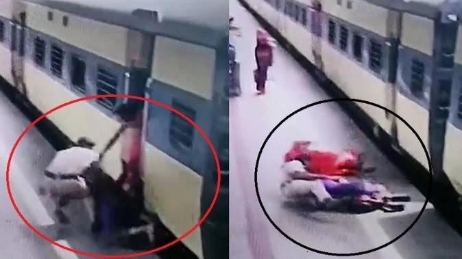The entire incident was captured on CCTV. It can be seen in the video that the woman has fallen from the moving train, her fellow woman is holding her. At the same time, the policeman standing on the platform falls on the woman and shows promptness to save the woman from going under the train.