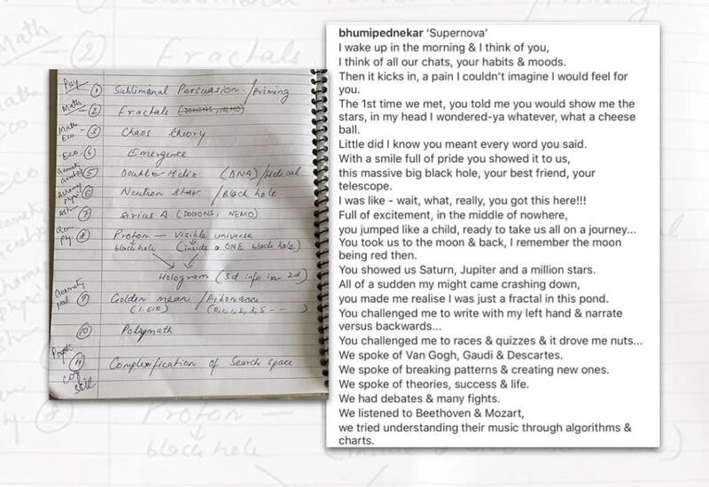 Sushant Singh Rajput, an engineering student before he became an actor, was passionate about astrophysics and science. However, his range of interests had no limits. Speaking of the actor's transformation from a co-star to a teacher, Ms Pednekar wrote: "Just like that, from a co-star you became a teacher. You turned me into a seeker, ready with her book and pen, waiting for class to begin. I remember your excitement on all the questions I asked, getting an answer from you wasn't easy. You turn that too into a learning task. You, my friend gave me an experience of a lifetime. You were like the emergence of a chaos. A chaos so different and potent it's hard to explain."