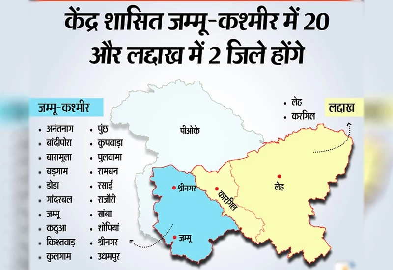 राज्य में अब तक 22 जिले थे। दो केंद्र शासित प्रदेश बनने के बाद जम्मू-कश्मीर में 20 और लद्दाख में 2 जिले होंगे।