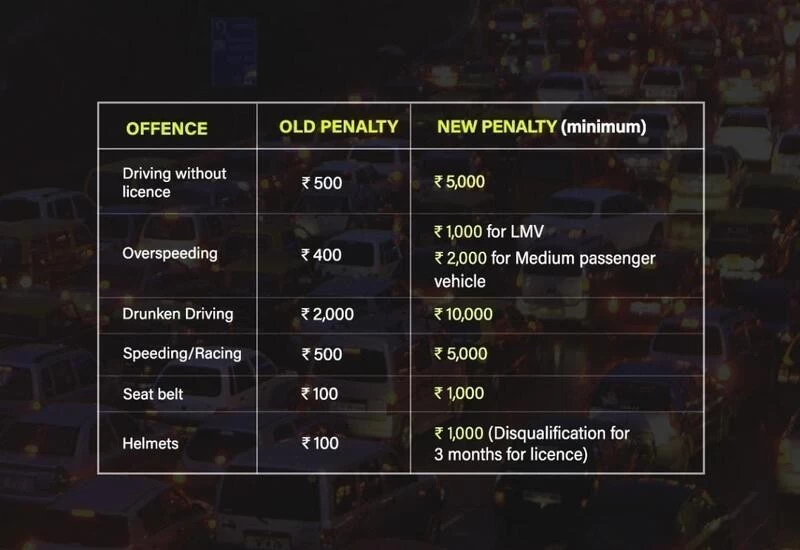 इसके अतिरिक्त फोर वीलर चलाने के दौरान सीट बेल्ट न लगाने पर 100 रुपये की जगह हजार रुपये, ड्राइविंग के दौरान बात करने पर 5,000 रुपये और ओवर स्पीड पर हल्की गाड़ियों को 1-2 हजार रुपये और मीडियम या कमर्शल वाहनों को 2-4 हजार रुपये जुर्माना भरना होगा।