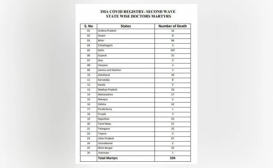 आईएमए ने राज्यवार डेटा जारी किया है, जिसमें बताया गया है कि किस राज्य में कितने डॉक्टरों ने कोरोना के खिलाफ जंग में अपनी जान गंवाई है। आंकड़ों के मुताबिक, कोविड-19 की दूसरी लहर में मरने वाले लगभग हर दूसरे डॉक्टर की या तो दिल्ली, बिहार या उत्तर प्रदेश में मौत हुई। दूसरी लहर में मरने वाले डॉक्टरों में इन तीनों राज्यों की हिस्सेदारी करीब 45 फीसदी है।