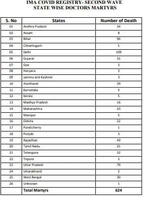 आईएमए ने राज्यवार डेटा जारी किया है जिसमें बताया गया है कि किस राज्य में कितने डॉक्टरों की मौत हुई है। आंकड़ों के अनुसार, बिहार में 96 डॉक्टर और उत्तर प्रदेश में 79 डॉक्टर की मौत हुई है। आंकड़ों के मुताबिक, कोविड-19 की दूसरी लहर में मरने वाले लगभग हर दूसरे डॉक्टर की या तो दिल्ली, बिहार या उत्तर प्रदेश में मौत हुई।