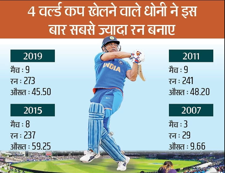 1. महेंद्र सिंह धोनी। पूर्व भारतीय कप्तान धोनी ने इस वर्ल्ड कप में 9 मैच में 273 रन बनाए। रनों के लिहाज से यह उनका सबसे बेहतरीन वर्ल्ड कप साबित हुआ। उन्होंने 2011 वर्ल्ड कप में 241 रन बनाए थे। 38 साल के धोनी ने अपने आखिरी वर्ल्ड कप मैच में न्यूजीलैंड के खिलाफ 50 रन बनाए, लेकिन टीम को जीत नहीं दिला सके। उन्हें मार्टिन गुप्टिल ने रनआउट कर दिया। इस हार के साथ ही टीम इंडिया का वर्ल्ड कप जीतने का सपना भी टूट गया।