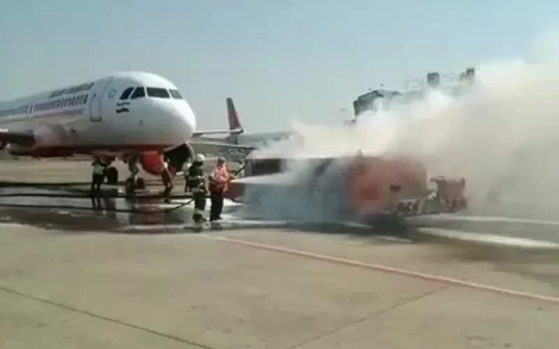 विमान से कुछ मीटर के दूर खड़े टो-व्हीकल में लगी आग पर समय पर काबू पा लिया गया।