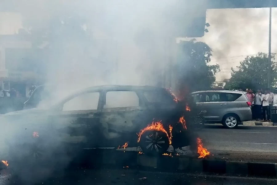 Burning Car Jaipur : शहर में एक चौंकाने वाली घटना घटी, जिसमें एक कार में अचानक आग लगने से हड़कंप मच गया। कार के ड्राइवर जितेंद्र ने बताया कि गाड़ी में अचानक धुआं उठने लगा, जिससे वह तुरंत सतर्क हो गया। जैसे ही उसने देखा कि आग तेजी से फैल रही है, उसने बिना वक्त गवाए हैंड ब्रेक लगाया और अपनी जान बचाने के लिए कार से छलांग लगा दी। लेकिन हैरानी की बात यह रही कि हैंड ब्रेक लगाने के बावजूद भी कार बेकाबू होकर सड़क पर दौड़ती रही।