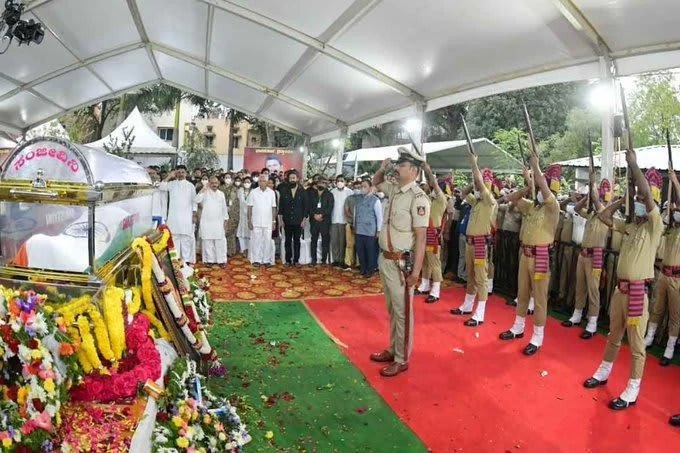 बेंगलुरु: कन्नड़ फिल्मों के सुपरस्टार पुनीत राजकुमार का अंतिम संस्कार कर दिया गया है। राजकीय सम्मान के साथ उनका अंतिम संस्कार बेंगलुरु के कांतीरवा स्टूडियो में किया गया। इस दौरान कर्नाटक के मुख्यमंत्री बसवराज बोम्मई मौजूद रहे और उन्हें श्रद्धांजलि अर्पित की। महज 46 साल की उम्र में पुनीत राजकुमार का शुक्रवार को हार्ट अटैक से निधन हो गया। उनके जाने से फिल्म इंडस्ट्री के साथ प्रशंसकों को सदमा लगा है। लोगों के दर्शन के लिए शव को बेंगलुरु के कांतीरवा स्टेडियम में रखा गया था। इस दौरान भारी संख्या में लोग अपने चहेते सितारे को आखिरी बार देखने पहुंचे।