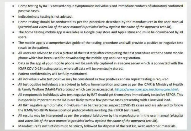 इसके साथ-साथ आईसीएमआर ने होम टेस्टिंग को लेकर एक एडवाइजरी भी जारी की है। अपनी एडवाइजरी में आईसीएमआर ने कहा है कि इस टेस्ट में जो लोग पॉजिटिव पाए जाएं, उन्हें सच में संक्रमित मान लिया जाए। दोबारा उनको टेस्ट कराने की जरुरत नहीं है। आईसीएमआर ने आगे यह भी कहा कि इस टेस्ट में जिसकी कोरोना रिपोर्ट निगेटिव आए उनकी आरटी-पीसीआर जांच जरूर करवाई जाए।