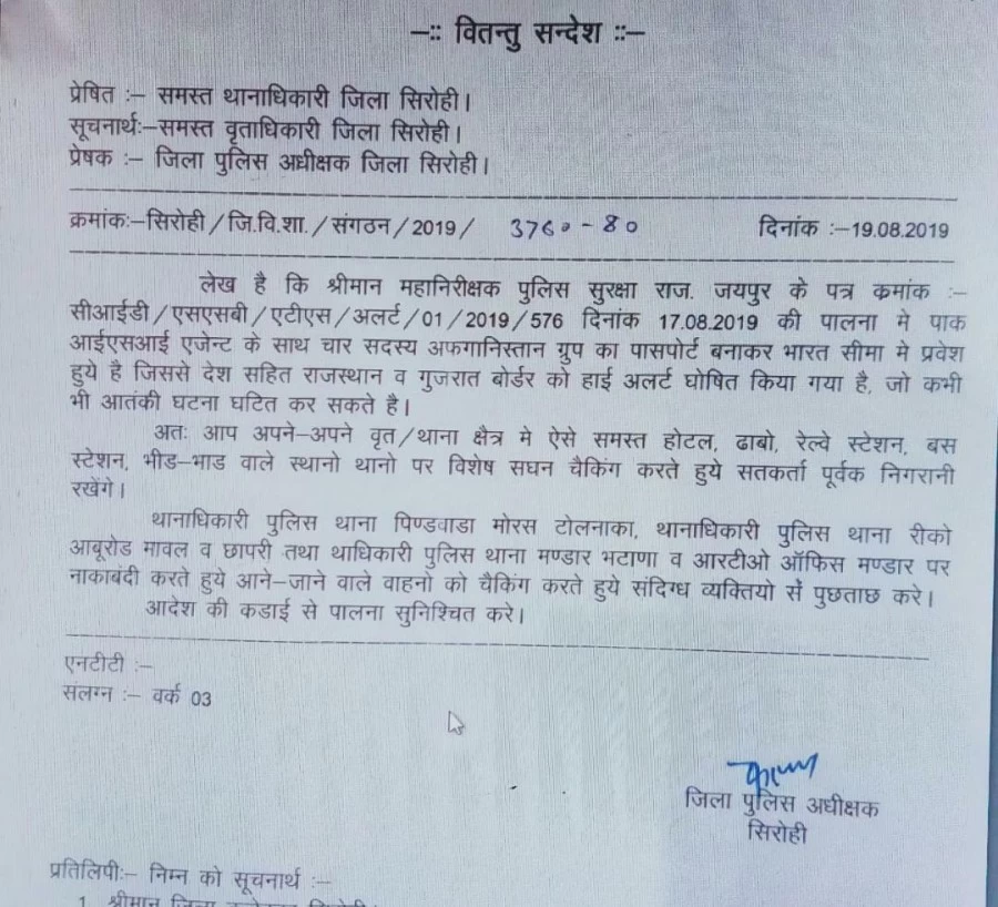 देश में एक पाकिस्तानी आईएसआई एजेंट के साथ चार जनों के अफगानिस्तान के पासपोर्ट बनाकर घुसने के बाद देशभर और राजस्थान व गुजरात बॉर्डर पर हाई अलर्ट किया गया है। परन्तु इस अलर्ट में लिखे मैसेज ने पुलिस की ढिलाई की कलई खोली है, जयपुर से मैसेज थाना स्तर तक पहुंचने में इतना समय लग गया है कि चौंक जाना लाजिमी है।