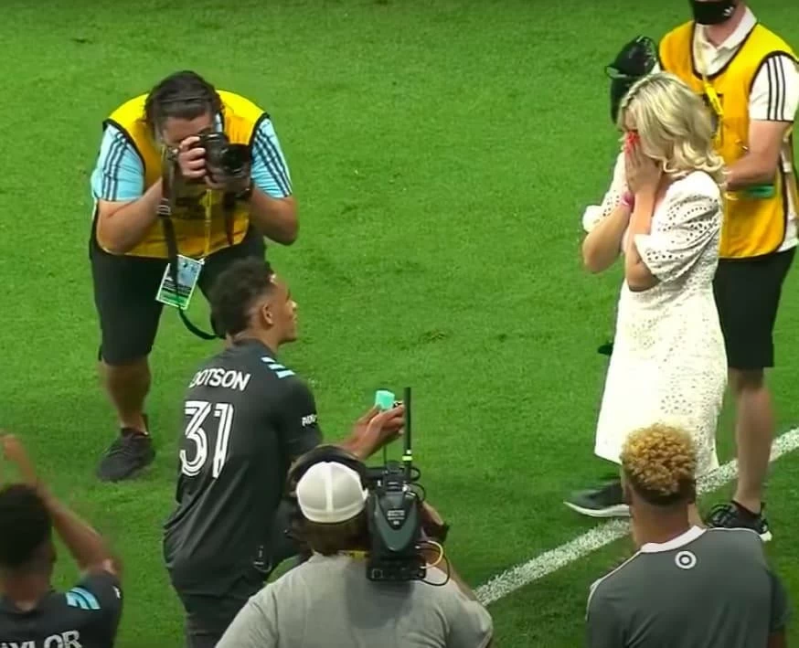 खेल डेस्क: अमेरिकी फुटबॉल खिलाड़ी हसनी डॉटसन स्टीफेंसन (American football player Hassani Dotson Stephenson) ने रविवार को मेजर लीग सॉकर (MLS) में सैन जोस अर्थक्वेक के खिलाफ अपने क्लब मिनेसोटा एफसी के 2-2 से ड्रॉ के बाद फुटबॉल के मैदान पर ही अपनी गर्लफ्रेंड को प्रपोज किया. सोशल मीडिया पर अमेरिकी फुटबॉलर द्वारा गर्लफ्रेंड को प्रपोज करने वाला वीडियो खूब वायरल हो रहा है. स्टीफेंसन ने अपने घुटने के बल नीचे बैठकर दर्शकों और खिलाड़ियों के सामने गर्लफ्रेंड को प्रपोज किया और साथ ही अंगूठी भी पहनाई. फुटबॉलर ने जब प्रपोज के लिए गर्लफ्रेंड की तरफ हाथ बढ़ाया तो प्रेमिया ने हां में सिर हिलाकर अपना जवाब दिया.