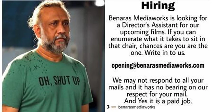 अनुभव के पोस्ट की बात करें तो, अनुभव ने लिखा है,' हायरिंग... बनारस मिडिया वर्क अपनी अपकमिंग फिल्मों के लिए असिस्टेंट डायरेक्टर की तलाश में है। और अगर आप अपने आप को इस काबिल समझते हैं और आप डायरेक्टर की कुर्सी पर बैठ सकते हैं तो हमें इस मेलआयडी 'ओपनिंग@बनारसमिडियावर्क.कॉम' पर मेल करें।'