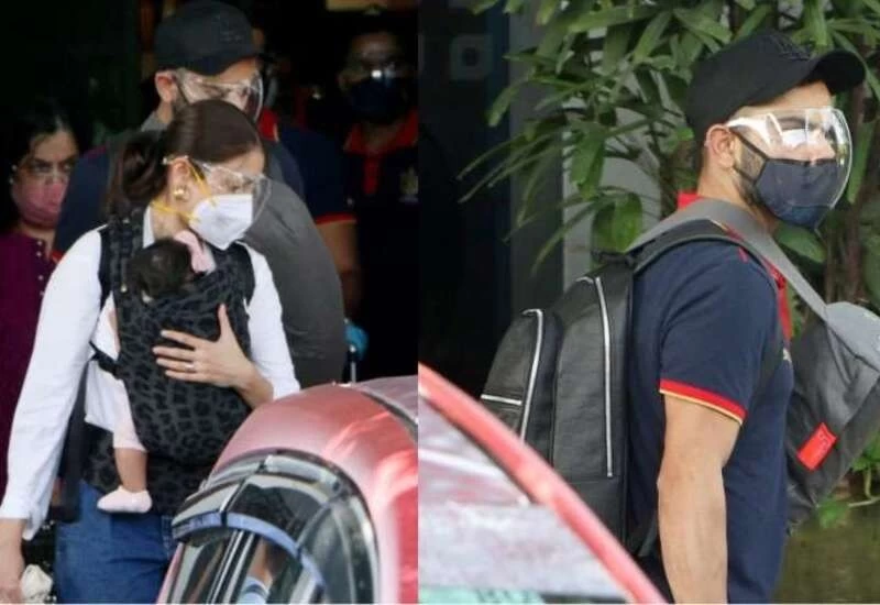 इस दौरान अनुष्का और विराट फेस शील्ड और मास्क लगाए दिखे। अनुष्का शर्मा ने बेटी वामिका को बेबी कैरियर में अपन सीने से लगा रखा था। एक हाथ से अनुष्का अपनी बेटी को पकड़ी दिखीं तो उनके दूसरे हाथ में एक छोटा सा क्लोथ बैग था।