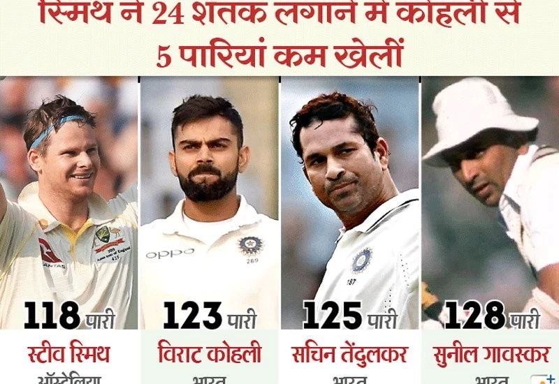 स्मिथ ने सबसे तेज 24 शतक लगाने के मामले में भारतीय कप्तान विराट कोहली, पूर्व क्रिकेटर सचिन तेंदुलकर और सुनील गावस्कर को पीछे छोड़ दिया। कोहली ने 24 शतक लगाने के लिए 123, सचिन 125 और गावस्कर ने 128 पारियां खेली थीं।