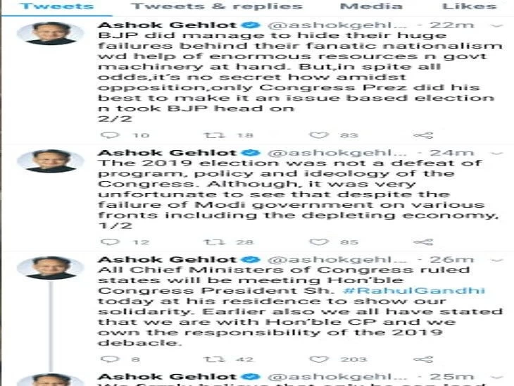 मुख्यमंत्री अशोक गहलोत ने एक-एक कर चार ट्वीट किए। जिनमें मुख्यमंत्री ने ट्वीट कर कहा कि आज अपनी एकजुटता दिखाने के लिए कांग्रेस शासित राज्यों के सभी मुख्यमंत्रियों की बैठक माननीय कांग्रेस अध्यक्ष राहुल गांधी से होगी। उनके निवास पर। गहलोत ने लिखा कि इससे पहले भी हम सभी ने कहा है कि हम कांग्रेस अध्यक्ष के साथ हैं और हम 2019 की पराजय की जिम्मेदारी लेते हैं।