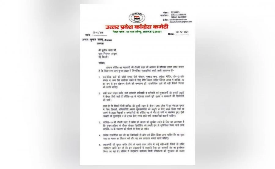 कांगेस ने मुख्य चुनाव आयुक्त को जो चिट्ठी लिखी हैं उसमें कोरोना की तीसरी लहर के बढ़ते खतरे को देखते हुए बड़ी रैलियों को रद्द करने की मांग की हैं. इसके साथ चुनाव आयोग से मांग की कि वो प्रधानमंत्री नरेन्द्र मोदी, सीएम योगी आदित्यनाथ के सरकारी मशीनरी का इस्तेमाल करके तमाम उद्घाटनों और उसके लिए होने वाले धन के इस्तेमाल पर रोक लगाए और इन इवेंट्स पर होने वाली बयानबाजी को रोके. इस चिट्ठी में कांग्रेस ने कहा कि "सभी राजनीतिक दलों को छोटी-छोटी सभाओं और नुक्कड़ सभाएं, वर्चुअल मीटिंग्स और डोर टू डोर कैंपेन की ही इजाजत दी जाए"