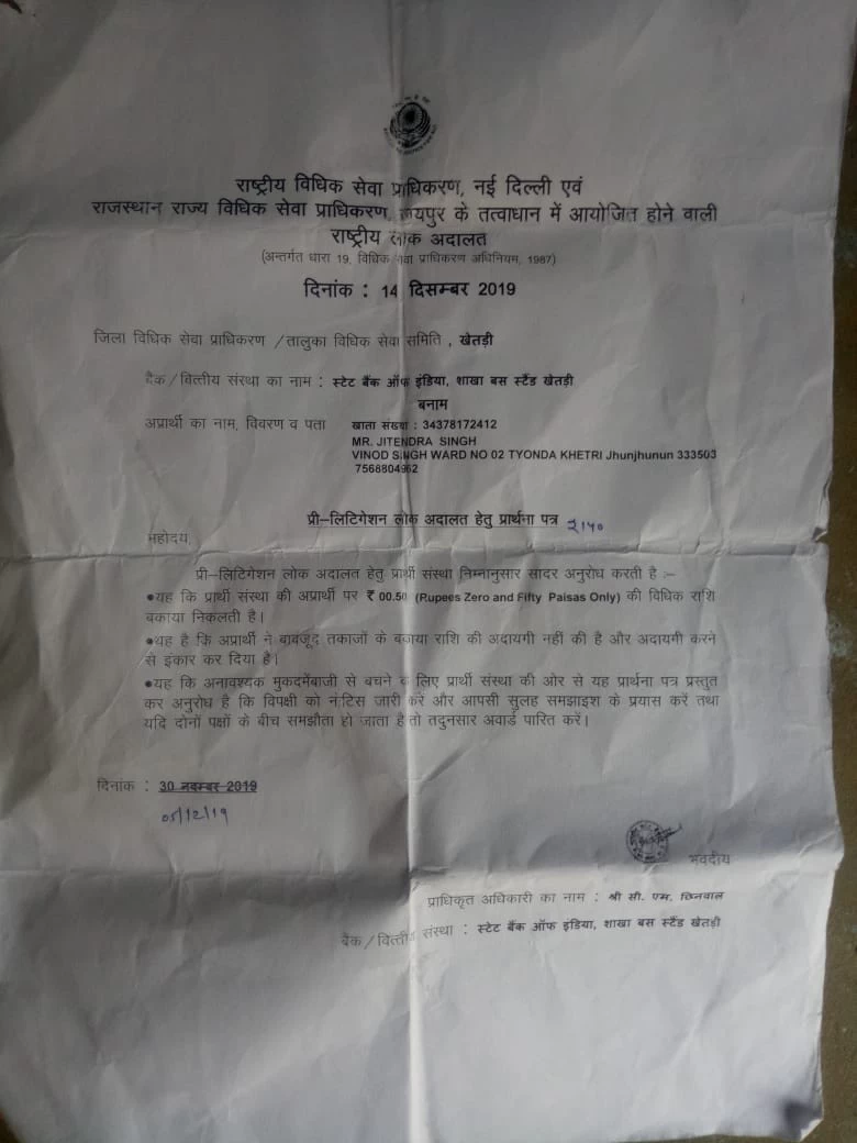 यह मामला है उपखंड के त्योंदा निवासी जितेंद्र कुमार पुत्र विनोद सिंह का। जानकारी के अनुसार जितेंद्र कुमार का खेतड़ी एसबीआई बैंक में जनधन खाता खुला हुआ है खाते में वर्तमान में 124 रूपये जमा भी है लेकिन फिर भी बैंक वालों ने गुरुवार रात्रि 11 बजे जितेंद्र के घर पहुंचकर 50 पैसे बकाया का नोटिस थमा दिया। जितेंद्र कुमार ने बताया कि नोटिस में लिखा हुआ था कि शनिवार को लोक अदालत में पहुंचकर 50 पैसे जमा करवाएं अन्यथा उनके खिलाफ कानूनी कार्रवाई की जाएगी। जितेंद्र की रीड की हड्डी में प्रॉब्लम और चलने फिरने में असमर्थ होने की वजह से उसके पिता विनोद सिंह डरे सहमे में खेतड़ी लोक अदालत में पहुंचे । 50 पैसे का नोटिस का मामला देखकर आसपास के ग्रामीण और वकीलों की भीड़ लोक अदालत में जमा हो गई और शर्म के मारे बैंक अधिकारी बिना पैसे जमा किए ही मौके से कुर्सी छोड़ कर रफूचक्कर हो गए। पीड़ित जितेंद्र के पिता विनोद सिंह ने बताया कि मैं सुबह से 50 पैसे जमा कराने के लिए अधिकारियों के चक्कर लगा रहा हूं लेकिन बैंक के अधिकारी पैसे जमा करने से मना कर रहे हैं। जितेंद्र के वकील विक्रम सिंह ने बताया कि मेरे क्लाइंट के पास 50 पैसे जमा करवाने का नोटिस एसबीआई बैंक अधिकारियों ने दिया था जब लोक अदालत में मेरा क्लाइंट 50 पैसे जमा करवा कर एनओसी लेने पहुंचा तो अधिकारियों ने पैसे जमा करने से मना कर दिया और मेरे क्लाइंट को एनओसी भी नहीं दी अब बैंक के खिलाफ कानूनी कार्रवाई और मानहानि का दावा पेश किया जाएगा।