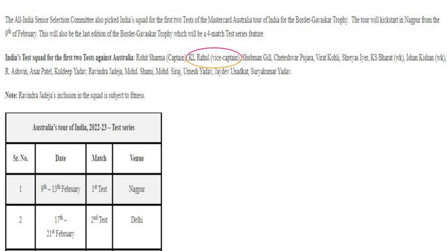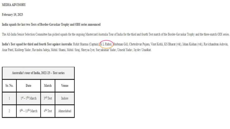 IND vs AUS: भारतीय टीम की ऑस्ट्रेलिया के खिलाफ आखिरी दो टेस्ट मैच और आगामी तीन मैचों की वनडे सीरीज के लिए बीसीसीआई द्वारा रविवार शाम को घोषणा की गई। टेस्ट टीम में कोई बदलाव नहीं किए गए वहीं वनडे टीम में रवींद्र जडेजा की वापसी हुई तो एक दशक यानी 10 साल के बाद इस फॉर्मेट में जयदेव उनादकट को भी चुना गया। इसके अलावा संजू सैमसन और सरफराज खान को दरकिनार करने पर भी कई सवाल उठे। पर इन सबके बीच जो सबसे बड़ा संकेत बोर्ड की तरफ से निकल कर आया वो था केएल राहुल को लेकर। दरअसल पहले दो टेस्ट मैच के लिए जारी स्क्वॉड में केएल राहुल ही उपकप्तान थे। पर आखिरी दो टेस्ट के लिए जिस तरह टीम को बीसीसीआई ने जारी किया, उससे हर तरफ यही सवाल था कि क्या बीसीसीआई ने राहुल से उपकप्तानी छीन ली है?सा हम नहीं कह रहे कि केएल राहुल से उपकप्तानी छिन गई है। ऐसा बीसीसीआई का संकेत कह रहा है जो उसने टीम को जारी करने के समय अपनी प्रेस रिलीज में दिए। पहले दो टेस्ट के लिए जो स्क्वॉड 13 जनवरी 2023 को जारी हुआ था उसमें राहुल के नाम के आगे वाइस कैप्टन लिखा हुआ था। पर इस बार 19 फरवरी 2023 को जो आखिरी दो टेस्ट मैचों के लिए स्क्वॉड जारी हुआ उसमें उनके नाम के आगे उपकप्तान नहीं था और ना ही किसी और के नाम के आगे ऐसा लिखा था। इसी के बाद सवाल उठे कि क्या राहुल से अब उपकप्तानी छिन गई है? हालांकि, बीसीसीआई की तरफ से ऐसा कुछ कहा नहीं गया लेकिन अगर पिछले कुछ समय की बात करें तो बांग्लादेश के खिलाफ वनडे सीरीज के बाद जब हार्दिक पंड्या की श्रीलंका सीरीज के लिए वनडे टीम में वापसी हुई थी तब भी बिना किसी ऐलान के राहुल से उपकप्तानी छीनकर हार्दिक को दी गई थी।