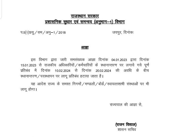 हालांकि नई सरकार के गठन के बाद बड़े स्तर पर आईएएस, आईपीएस, आरएएस और आरपीएस अधिकारियों के तबादले किए जा चुके हैं. इनमें कई जिलों में कलेक्टर, पुलिस अधीक्षक, अतिरिक्त जिला कलेक्टर, उपखंड अधिकारी और पुलिस उपाधीक्षक बदले जा चुके हैं. लेकिन निचले स्तर के अधिकारियों और कर्मचारियों के तबादलों पर अभी बैन लगा हुआ है. इनमें टीचर्स और पुलिसकर्मियों समेत अन्य अधिकारी-कर्मचारी शामिल हैं.विधानसभा चुनाव संपन्न होने के बाद से ही ये अधिकारी और कर्मचारी तबादला सूचियों का इंतजार कर रहे हैं. कुछ समय बाद फिर लोकसभा चुनाव आने वाले हैं. लिहाजा उससे पहले सरकार तबादलों का एक दौर पूरा कर लेना चाहती है. इसी कड़ी में यह कवायद की जा रही है. बीते दिनों में कलेक्टर, एडीएम, एसडीएम, एसपी, एएसपी और डीएसपी के तबादले विधायकों डिजाइजर के बिना किए गए थे. इस बार विधायकों की अनुशंसा को ध्यान में रखा जाएगा.