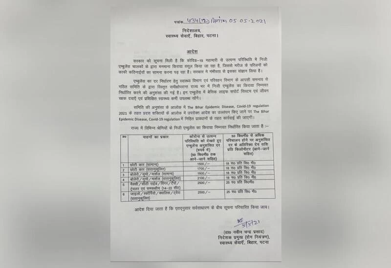 पटना: स्वास्थ्य विभाग ने निजी एम्बुलेंस चालकों की मनमानी पर रोक लगाने के लिए निजी एम्बुलेंस का किराया तय कर दिया है। स्वास्थ्य विभाग के निदेशक प्रमुख डॉ. नवीन चंद्र प्रसाद ने बुधवार को किराया निर्धारण सम्बन्धी आदेश जारी कर दिया। इस आदेश के अनुसार स्वास्थ्य विभाग और परिवहन विभाग की समिति ने विस्तृत समीक्षा के बाद निजी एम्बुलेंस का किराया निर्धारित किया है। इसका उल्लंघन करने वालो पर बिहार आपदा नियंत्रण कोविड 19 कानून के तहत कार्रवाई की जाएगी। इन एम्बुलेंस में लाइफ सपोर्ट सिस्टम, जीवन रक्षक दवाएं एवं प्रशिक्षित स्वास्थ्यकर्मी उपलब्ध होने चाहिए।