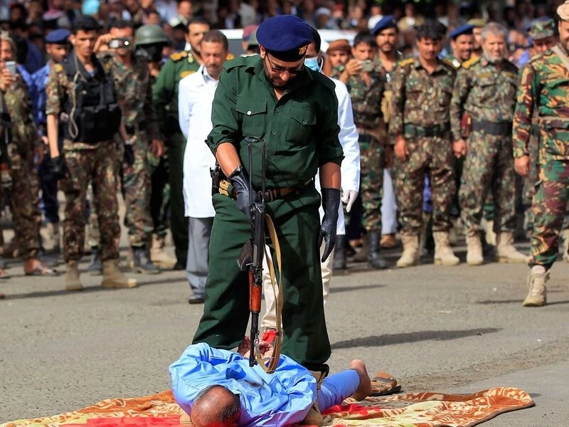 यमन की राजधानी सना में बच्चों के हत्यारों को मौत की सजा दी गई, लेकिन ये सजा बेहद ही खौफनाक थी। राजधानी पर कब्जा कर चुके हूती विद्रोहियों ने हत्या के तीन आरोपियों को भीड़ के सामने बीच चौराहे पर ले जाकर गोलियों से भून दिया। मरने के बाद इनकी लाशों को क्रेन से हवा में लटकाया गया। लोगों की लाशों को कालीन में लपेटकर वहां से हटा दिया गया।