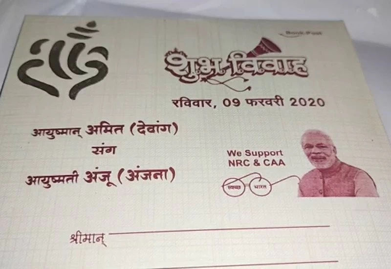 सीकर | सीकर के दाधीच नगर के रहने वाले अमित कुमार ने अपनी शादी के कार्ड में बाकायदा सीएए व एनआरसी का समर्थन का स्लोगन छपवाया है।जिसकी सोशल मीडिया पर खासी चर्चा है और लोग इसे सोशल मीडिया पर लाइक कर रहे हैं, उन्होंने शादी कार्ड पर प्रधानमंत्री नरेंद्र मोदी की फोटो भी छपाई है। अमित कुमार का कहना है कि देश हित में प्रधानमंत्री नरेंद्र मोदी द्वारा लिए गए फैसले का वे परंपरागत रूप से आयोजित होने वाले समारोह में भी समर्थन करते हैं। इसके अलावा भी दिल से इसका समर्थन करते हैं इसलिए उन्होंने शादी के कार्ड में यह स्लोगन छपवाया है।